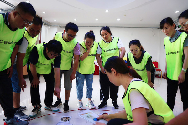 在正式活動(dòng)之前,教官通過一系列輕快的活動(dòng),建立相互信任的和諧團(tuán)隊(duì)氛圍。緊接著在教官的指導(dǎo)下,康科德各成員迅速組成四個(gè)小隊(duì),經(jīng)過競選隊(duì)長、編排隊(duì)名、口號(hào)等內(nèi)容搭建,迅速誕生出“科學(xué)隊(duì)”、“德云坊隊(duì)”、“同心同德隊(duì)”、“德信隊(duì)”四個(gè)隊(duì)伍。