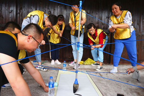 “共書未來”活動(dòng)中,各隊(duì)成員同執(zhí)一支筆,把此次的收獲融合企業(yè)文化總結(jié)成了四字成語共同書寫在四尺紙卷上。